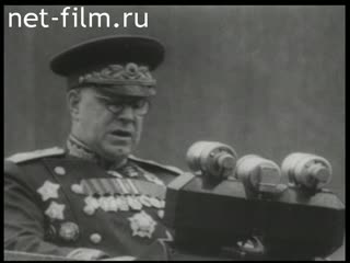 Parade participants listen to the speech of Marshal G.K. Zhukov - different shots. I.V. Stalin on the tribune of the Mausoleum listens to the speech of G. Zhukov.