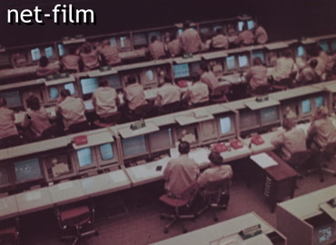 The main hall of the Mission Control Center: professional staff with foreign delegation is present, people watching the screens.