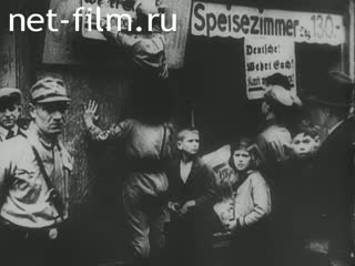 A crowd of stormtroopers with anti-Semitic posters at the entrance to a shop on a Berlin street.