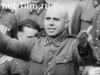Marching groups of young people under the flag with a swastika.