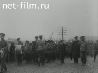 Students of military schools and secondary schools march on the road, accompanied by a brass band.