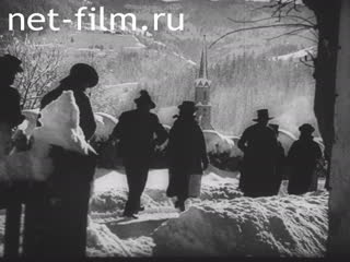 Mountain village, residents in national costumes.
