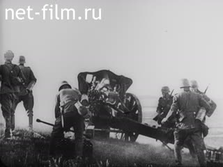 Broken guns, tanks, a column of German soldiers, a soldier shoots from a flamethrower.