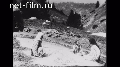 View of part of the aul, a horse standing near a yurt, a collective farmer bringing a cow to the communal herd in 1930. Text of the act of surrender of surplus livestock.