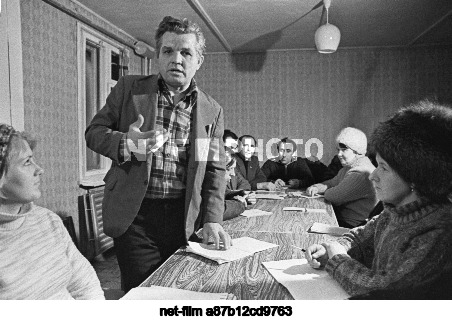 USSR. Irkutsk Region. Member of the CPSU, head of the concrete and mortar junction of the Kunerma railway station N.K. Avdoshko during a speech at a class of the political education circle at the construction and assembly train No. 582 of the Angarstroy Directorate at the Kunerma station of the western section of the Baikal-Amur Mainline. Edgar Bryukhanenko/TASS