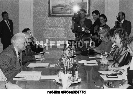USSR. Moscow. USSR Foreign Minister Eduard Amvrosievich Shevardnadze (left) and the international coordinator of the movement "Women for a Productive Summit", President of the Women's Union of Greece Margaret Papandreou (second from right) during negotiations. Vladimir Yatsina, Roman Poderni /TASS