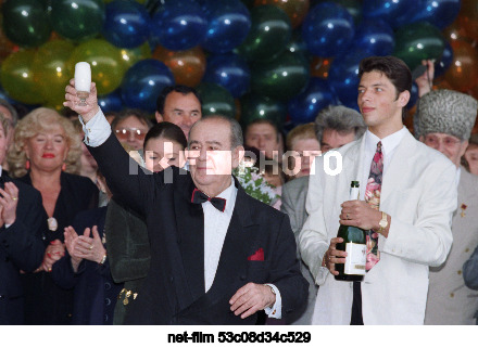 Russia. Moscow. Russian actor and entertainer, artistic director and director of the Moscow State Variety Theatre Boris Sergeyevich Brunov (left, foreground) during the ceremonial opening of a plaque dedicated to him, dedicated to his 75th birthday, on the Square of Stars at the main entrance to the State Central Concert Hall "Russia" in the building of the hotel of the same name. Oleg Buldakov/TASS