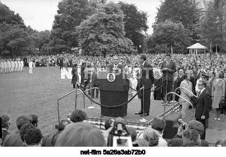 USA. Washington. General Secretary of the CPSU Central Committee Leonid Ilyich Brezhnev, US President Richard Milhous Nixon and L. I. Brezhnev's personal interpreter Viktor Mikhailovich Sukhodrev (from left to right on the platform) during the official welcoming ceremony at the White House. Vladimir Musaelyan, Valentin Sobolev/TASS
