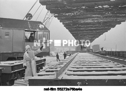 USSR. Irkutsk Region. Carpenter foreman Mikhail Fistik, dressed as Father Frost, during the laying of rails at the Kirenga station on the western section of the Baikal-Amur Mainline. Father Frost appeared at the central base of construction and assembly train No. 391 in the settlement of Magistralny, handed over keys to apartments, visited a school, and worked on laying the rails. Edgar Bryukhanenko/TASS