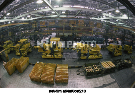November 1986. USSR. Chelyabinsk. Assembly of T-130M tracked agricultural and industrial tractors on a conveyor in a workshop of the production association "Chelyabinsk Tractor Plant named after V. I. Lenin". Boris Klipinitser/TASS