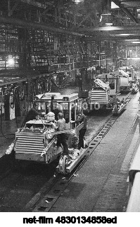 USSR. Chelyabinsk. Assembly of T-130 tracked agricultural and industrial tractors on the main conveyor of the production association "Chelyabinsk Tractor Plant named after V. I. Lenin". Boris Klipinitser/TASS