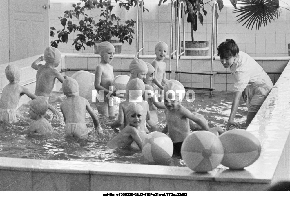 USSR. Orenburg Region. A teacher and children during a lesson in the swimming pool of the new Solnyshko kindergarten, built with the funds of the Gorky collective farm in the Perevolotsky district. Alexey Poddubny/TASS