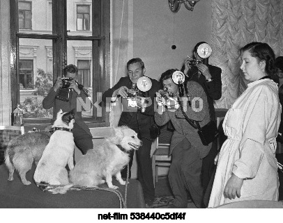 USSR. Moscow. June 8, 1957. Dogs Kozyavka, Linda and Malyshka (from left to right), who took part in a rocket flight into the upper layers of the atmosphere (110 meters) during a press conference dedicated to the International Geophysical Year in the conference hall of the State Committee for Cultural Relations with Foreign Countries. Nikolai Rakhmanov/TASS