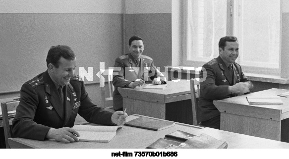 March 1964. USSR. Moscow. Heroes of the Soviet Union, pilot-cosmonauts Yuri Alekseyevich Gagarin, Valery Fyodorovich Bykovsky and Pavel Romanovich Popovich (from left to right) during classes at the Nikolai Yegorovich Zhukovsky Air Force Engineering Academy. The exact date of the photo is unknown. Valentin Cheredintsev/TASS