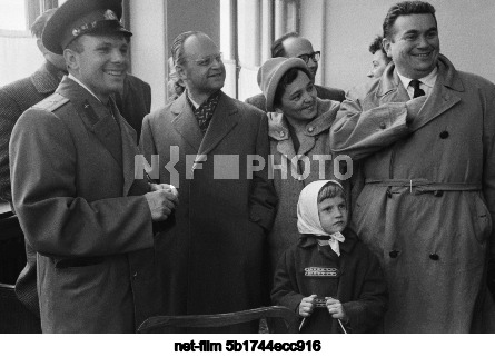 USSR. Moscow Region. The first person in the world to fly into space, Hero of the Soviet Union, USSR pilot-cosmonaut Yuri Alekseyevich Gagarin (left) and employees of the Czechoslovakian embassy at Sheremetyevo Airport before their flight to Prague. Valentin Mastyukov/TASS