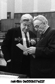December 9-11, 1964. USSR. Moscow. Laureate of two Stalin Prizes, poet and literary critic Alexei Aleksandrovich Surkov and First Secretary of the Union of Writers of the USSR, writer and journalist Konstantin Aleksandrovich Fedin during a break between meetings of the fifth session of the Supreme Soviet of the USSR of the sixth convocation. The exact date of the photo is unknown. Valentin Sobolev/TASS