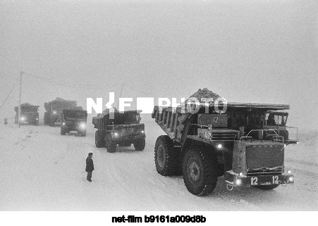January 1-25, 1983. USSR. Murmansk Region. BelAZ quarry dump trucks hauling apatite ore from the Central mine of the S. M. Kirov Production Association. The exact date of the photo is unknown. Semyon Maisterman/TASS