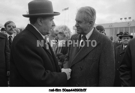 USSR. Moscow. USSR Foreign Minister Andrei Andreyevich Gromyko, US Secretary of State Cyrus Vance (left to right in the foreground) and USSR Deputy Foreign Minister Georgy Markovich Kornienko (right in the background) during the farewell ceremony for the American delegation at Vnukovo Airport. Eduard Pesov, Valentin Cheredintsev/TASS