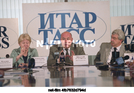 Russia. Moscow. First Deputy Minister of Culture of the Russian Federation Natalya Leonidovna Dementyeva, Minister of Culture of the Russian Federation Mikhail Efimovich Shvydkoy and First Deputy Director General of ITAR-TASS Mikhail Solomonovich Gusman (from left to right) during a press conference at the Russian news agency ITAR-TASS. Viktor Velikzhanin/TASS