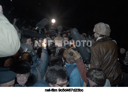 USSR. Moscow. Human rights activist, academician of the USSR Academy of Sciences, theoretical physicist Andrei Dmitrievich Sakharov (center) during a ceremony to welcome him at the Yaroslavsky railway station upon his return from seven years of exile in the city of Gorky. Valentin Kuzmin, Valentin Sobolev/TASS