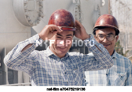 October 1985. USSR. Turkmen SSR. Turkmen SSR. Mary. Electricians Rakhman Khudainazarov and Ilmurat Kurbanniyazov (left to right) during a work shift at the Mary State District Power Plant named after the 50th Anniversary of the USSR. The exact date of the photo is unknown. Sapargeldy Rozyev, Alexander Yakovlev/TASS