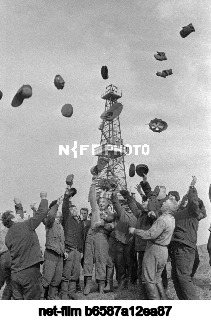 USSR. Chechen-Ingush ASSR. Members of the advanced team of subsoil explorers of the Malgobek Drilling Directorate, headed by CPSU member G. Khantemirov, who found oil in the spurs of the Sunzhensky Range while drilling a well 3,190 meters deep in the Kharbizhin area. Rudolf Dik/TASS