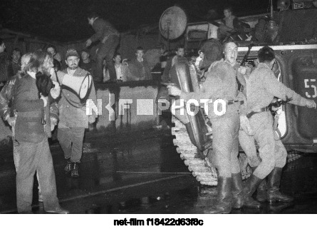 USSR. Moscow. Clashes between protesting supporters of USSR President Mikhail Sergeyevich Gorbachev and RSFSR President Boris Nikolayevich Yeltsin and servicemen of the Taman Division near the Tchaikovsky Tunnel on the Garden Ring on the night of August 20-21, 1991, after a state of emergency was declared in the country during an attempted coup d'état. In order to prevent the signing of the Union Treaty, which was to replace the USSR with a new federation of sovereign states, representatives of the highest Soviet leadership, headed by USSR Vice President Gennady Ivanovich Yanayev, removed the president of the USSR from power and created the State Committee for the State of Emergency (GKChP). Sergei Mamontov/TASS