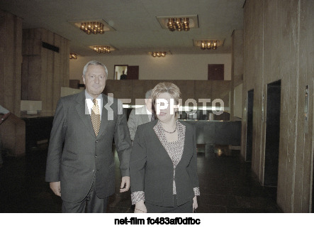 Russia. Moscow. ITAR-TASS Director General Vitaly Nikitich Ignatenko, Deputy Prime Minister of the Russian Federation for Social Affairs Galina Nikolaevna Karelova and First Deputy Director General of TASS Mikhail Solomonovich Gusman (background) in the lobby on the first floor of the main building of the Russian news agency ITAR-TASS on Tverskoy Boulevard. Fyodor Savintsev/TASS