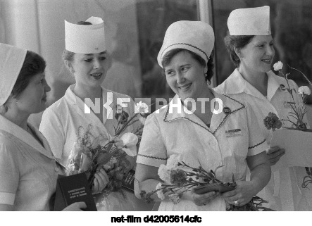 USSR. Stavropol Krai. Pyatigorsk. Winners of the "Best in Profession" competition among nurses and orderlies of the Pyatigorsk Balneophysiotherapy Association: nurses Vera Bender and Larisa Lutsenko, orderly Lyudmila Zharova and nurse Tatyana Magomedova (from left to right) during the award ceremony with honorary certificates and valuable prizes. Konstantin Tarusov/TASS