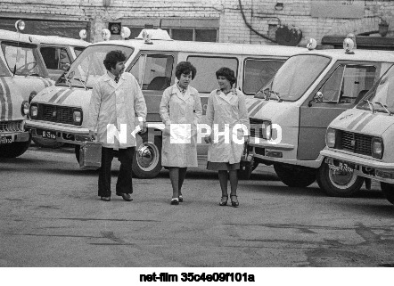 May 1978. USSR. Tomsk. The best cardiology team of the emergency medical care: paramedic G. Dzhavadov, cardiologist R. Zakharova and paramedic R. Sorokina (from left to right) near the RAF-977 "Latvia" and RAF-2203 "Latvia" ambulances on the territory of the City Clinical Hospital No. 3 in the Kirov District. The exact date of the photo is unknown. Vladimir Kazantsev/TASS