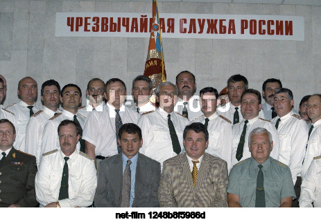 Russia. Moscow. Head of the Civil Defense Academy of the Russian Emergencies Ministry Vladilen Ivanovich Sychev (second from left in the foreground) and the Minister of the Russian Federation for Civil Defense, Emergencies and Elimination of Consequences of Natural Disasters Sergei Kuzhugetovich Shoigu (center in the foreground) during the graduation ceremony of the first officers who completed their training at the academy. Oleg Buldakov/TASS