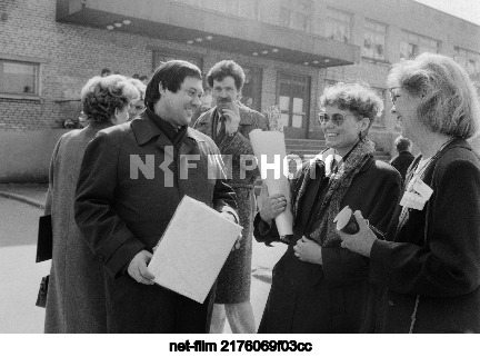 USSR. Novgorod. Head of the city department of public education, USSR People's Deputy Vladimir Nikolaevich Averkin and guests from Sweden Undis Kentvist and Virki Palliksen (left to right in the foreground) after visiting school No. 21 during the Days of the Land of Värmland. Alexander Ovchinnikov/TASS