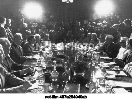 India. New Delhi. Chairman of the Council of Ministers of the USSR Alexei Nikolayevich Kosygin (third from left) and Prime Minister of India Morarji Desai (second from right) during Soviet-Indian negotiations. Telephoto. Highest possible quality. Viktor Koshevoy/TASS