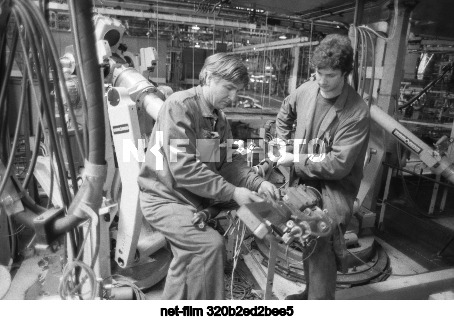 USSR. Moscow. Robot adjuster Nikolai Denisov and French adjuster specialist Serge Mivier (left to right) debugging a new robotic line for welding car bodies at the Lenin Komsomol Automobile Plant of the Moskvich production association. French specialists, together with Soviet installation organizations, supervised the installation of technological and welding equipment for welding bodies. Albert Pushkarev/TASS