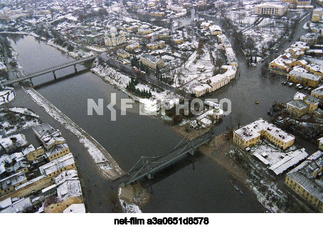 November 12-15, 1989. Russia. Kalinin Region. Torzhok. Bird's eye view of the Tvertsa River, a pedestrian bridge (foreground), a road bridge and the Transfiguration Cathedral (background) and 9 January Square (right). The exact date of the photo shoot is unknown. Igor Zotin/TASS