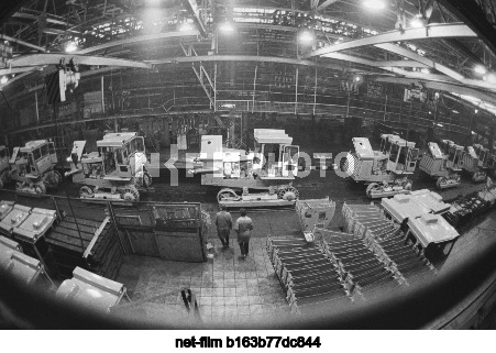 USSR. Chelyabinsk. T-130M tracked agricultural and industrial tractors in the assembly shop of the Chelyabinsk Tractor Plant named after V. I. Lenin production association on the day of the All-Union Leninist Communist Subbotnik. Boris Klipinitser/TASS