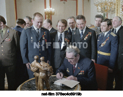 USSR. Moscow. General Secretary of the CPSU Central Committee, Chairman of the Presidium of the Supreme Soviet of the USSR Leonid Ilyich Brezhnev (foreground), pilot-cosmonaut of the Czechoslovak Socialist Republic Vladimir Remek, pilot-cosmonaut of the USSR, twice Hero of the Soviet Union Oleg Grigorievich Makarov, pilot-cosmonaut of the USSR, twice Hero of the Soviet Union Georgy Mikhailovich Grechko, pilot-cosmonaut of the USSR Aleksei Aleksandrovich Gubarev (from left to right, background), pilot-cosmonaut of the USSR Vladimir Aleksandrovich Dzhanibekov, pilot-cosmonaut of the USSR Georgy Timofeevich Beregovoy and Secretary of the Presidium of the Supreme Soviet of the USSR Mikhail Porfiryevich Georgadze (from left to right, third background) during the ceremony of signing by L.I. Brezhnev of his book "On the Lenin Course" for A.A. Gubarev and V. Remek, awarded the Gold Star medal of the Hero of the Soviet Union for the successful implementation of space flight on the orbital research complex Salyut-6 - Soyuz. Eduard Pesov/TASS