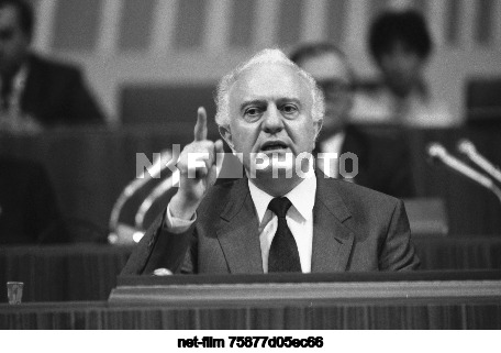 USSR. Moscow. Hero of Socialist Labor, member of the Politburo of the CPSU Central Committee, Minister of Foreign Affairs of the USSR Eduard Amvrosievich Shevardnadze during a speech at a meeting of the XXVIII Congress of the Communist Party of the Soviet Union in the Kremlin Palace of Congresses. Vladimir Musaelyan, Eduard Pesov/TASS