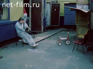 Повседневная жизнь цирка: дети с родителями, жилые вагончики, быт артистов, репетиции во дворе.