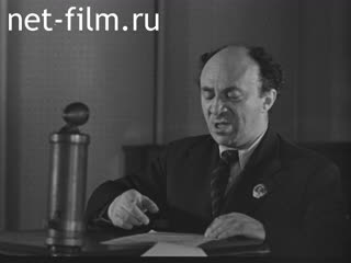 Михоэлс выступает с трибуны с обращением к евреям всего мира (синхронно), участники митинга слушают его выступление, среди них-Зак Я.И.
