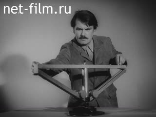 Комната, демонстрируется физический эксперимент (закон сохранения кинетического момента относительно оси), в кадре крутящийся стул-платформа, на стене висит портрет ученого-механика Жуковского Н. Е. Мужчина походит к стулу, садится на него, берет в руки колесо, раскручивает его, при этом стул-платформа начинает вращаться в обратную сторону.