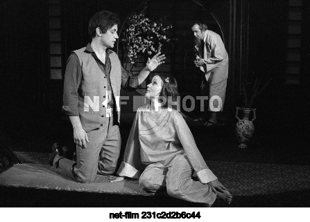 СССР. Амурская область. Благовещенск. Актеры Амурского областного театра драмы: В.И. Епифанов (слева), в роли Чжоу Пина, сына председателя правления акционерной угольной компании; А.Ф. Харисова в роли возлюбленной Чжоу Пина, служанки в доме; и В.Г. Матвеев (на втором плане) в роли Лу Гуйя, отца возлюбленной Чжоу Пина, слуги в доме - в сцене из спектакля "Тайфун" по пьесе китайского драматурга Цао Юйя в постановке московского режиссера Н.А. Мокина. Художник декораций - В.И. Попов, музыкальное оформление - М.Г. Волгина. Виктор Мариковский/ТАСС