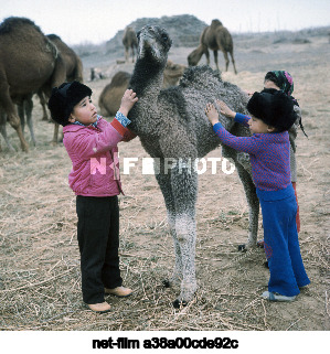 Апрель 1977 г. СССР. Туркменская ССР. Дети колхозников, играющие с верблюжонком на пастбище в пустыне Каракумы. Точная дата и место съемки не установлены. Виктор Великжанин, Сапаргельды Розыев/ТАСС