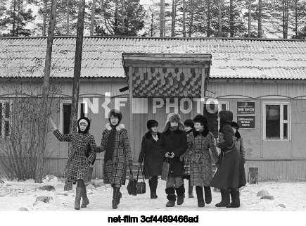СССР. БурятскаяАССР. Учащиеся у здания детской школы искусств в поселке Северомуйск на западном участке Байкало-Амурскоймагистрали. Григорий Калачьян, Владимир Матвиевский/ТАСС