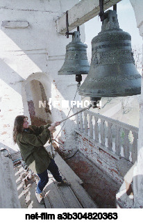 Май 1990 г. СССР. Владимирская область. Суздаль. Учащаяся отделения реставрации живописи Суздальского художественного училища, звонарь Анна Розина во время игры на колоколах в звоннице Спасо-Евфимиева мужского монастыря, построенной в XVI веке. Точная дата съемки не установлена. Геннадий Попов/ТАСС