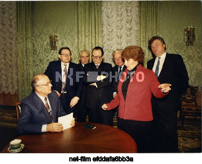СССР. Москва. Генеральный секретарь Центрального комитета Коммунистической партии Советского Союза Михаил Сергеевич Горбачев (на первом плане) во время подготовки к записи новогоднего обращения к гражданам для Центрального телевидения СССР. Калерия Кислова/ТАСС