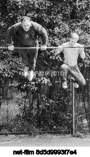1-5 октября 1978 г. СССР. Москва. Борец классического стиля, чемпион XVI летних Олимпийских игр, заслуженный тренер СССР Анатолий Иванович Парфенов и борец классического стиля А. Любах (слева направо) во время выполнения упражнений на турнике. Точная дата съемки не установлена. Игорь Уткин/ТАСС