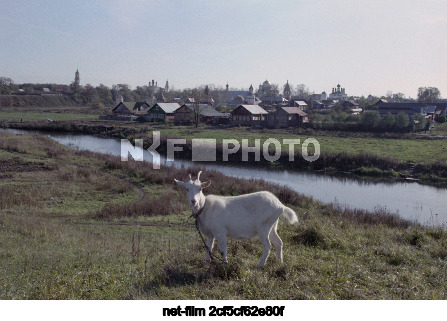 1-23 июля 1995 г. Россия. Владимирская область. Суздаль. Коза на пастбище и жилые дома на левом берегу реки Каменки. Точная дата съемки не установлена. Геннадий Попов/ТАСС