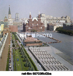 СССР. Москва. Вид на Сенатскую и Никольскую башни Кремля, некрополь у Кремлевской стены, мавзолей В. И. Ленина, здание Государственного исторического музея, здание ГУМа на Красной площади (слева направо) и здание гостиницы "Москва" на площади 50-летия Октября (справа на дальнем плане) со Спасской башни Московского Кремля. Игорь Зотин, Борис Кавашкин/ТАСС