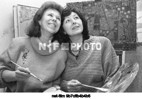 Декабрь 1990 г. СССР. Москва. Советские художницы-авангардистки Светлана Николаевна Калистратова и Елена Михайловна Келлер (слева направо) во время совместной работы в художественной мастерской. Точная дата съемки не установлена. Олег Булдаков/ТАСС